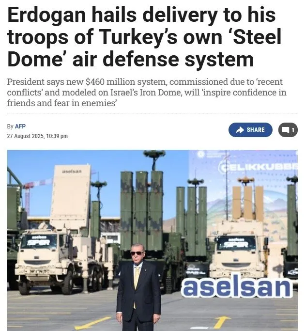 Times of Israel gazetesi, Çelik Kubbe'nin TSK'ya edilmesini Başkan Erdoğan'ın, "Dostta güven, düşmanda korku uyandıracak" sözleriyle verdi.