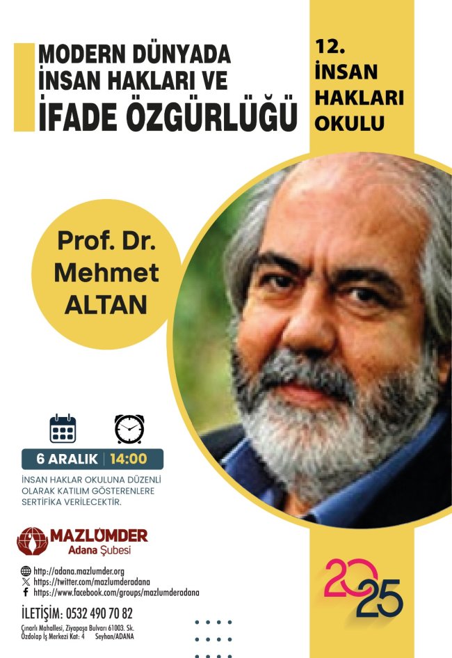 Beşinci ve son hafta için (06.12.2025) Modern Dünyada İnsan Hakları ve İfade Özgürlüğü -konu ders için Prof. Dr. Mehmet Altan Adana Mazlumder’in misafiri olacaklar.