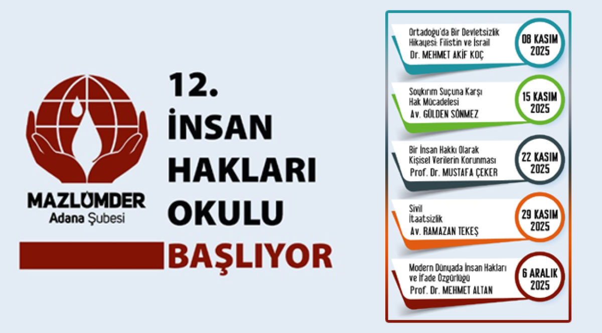 Mazlumder Adana Şube başkanlığının geleneksel İnsan Hakları Okulu Dersleri bu hafta sonu başlıyor