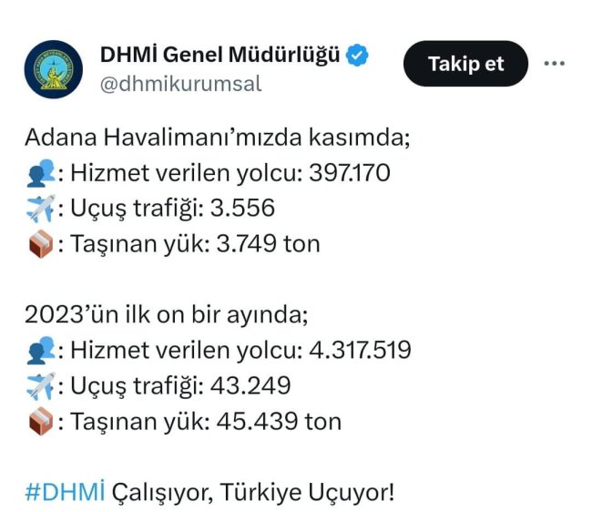 Adana Şakirpaşa Havalimanı, 2023'ün 11 ayında 4.3 milyon yolcuya hizmet verdi