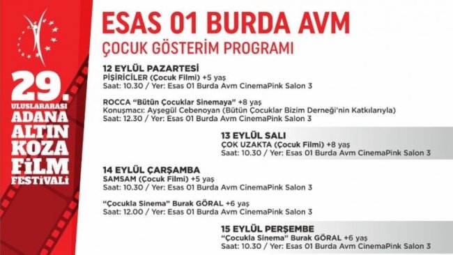 dünyanın farklı coğrafyalarından kültürler, farklı renkler, gelenekler ve yaşam tarzlarıylabuluşacak. Festival programında gösterilecek filmler, çocukların gelişim basamakları ve psiko-pedagojik yapılarına yönelik, 5-6, 7-8 yaş gruplarına yönelik farklı filmlerden oluşuyor. Esas 01 Burda AVM sinemalarında gösterilecek “Pişiriciler”, “Rocca”, “Çok Uzakta”, “Samsam” ve “Kuzular Firarda: Uzay Parkı” filmlerini küçük sinemaseverler ücretsiz olarak izleyebilecek. Çocuk etkinlikleri kapsamında ayrıca, ‘’Bütün Çocuklar Bizim Derneği’’nin katkılarıyla Ayşegül Cebenoyan’ın konuşmacı olacağı “Bütün Çocuklar Sinemaya” ve senarist ve film eleştirmeni Burak Göral’ın çocuklar ve ebeveynlerle bir araya geleceği “Çocukla Sinema” buluşmaları gerçekleşecek. Festival kapsamında düzenlenecek film gösterimleri ve etkinlik programı: CİNEMAPİNK SALON 3 (ESAS 01 BURDA AVM)