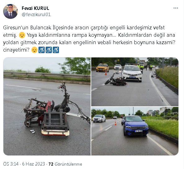 Onlar adına, Engelliler Komitesi Başkanı Fevzi Kurul, sosyal medya hesabından serzenişte bulunarak; Kaza mı, cinayet mi? sorusunu soruyor!