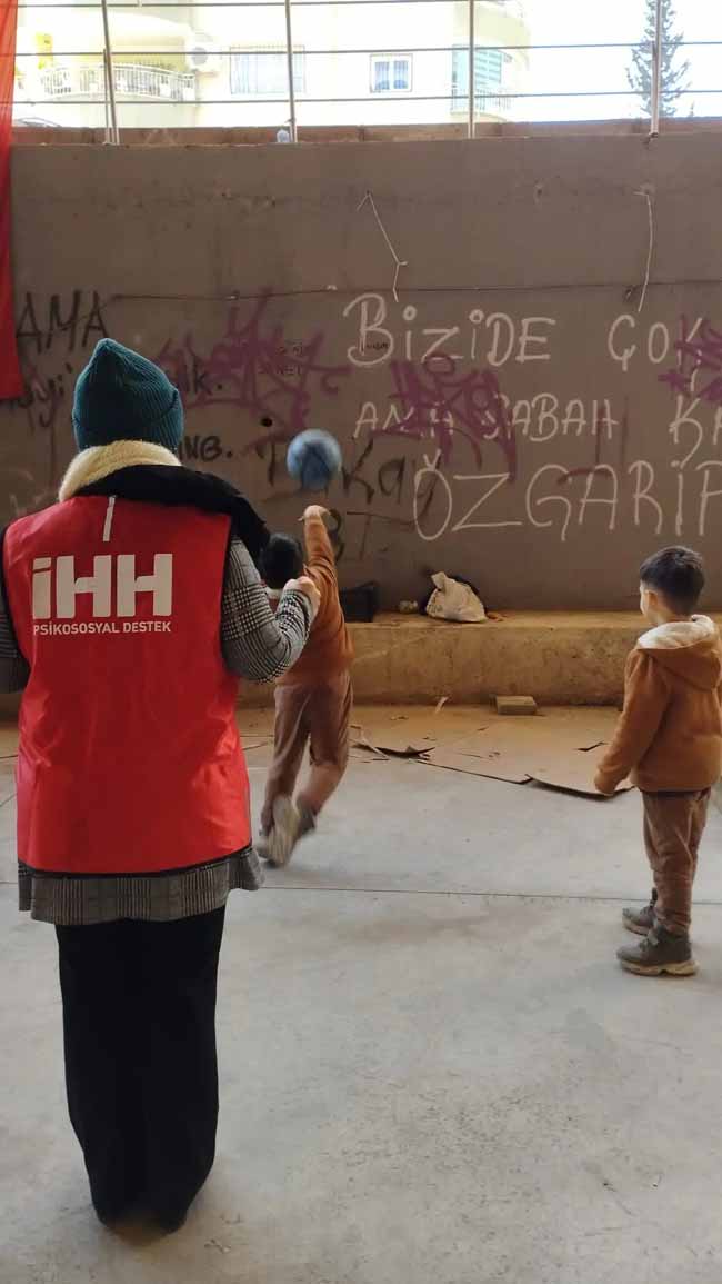 Adana'da kurulan çadırlarda kalan çocuklara yönelik 7 kişilik Psiko-sosyal destek ekibi ile çalışmalarını sürdürüyor.