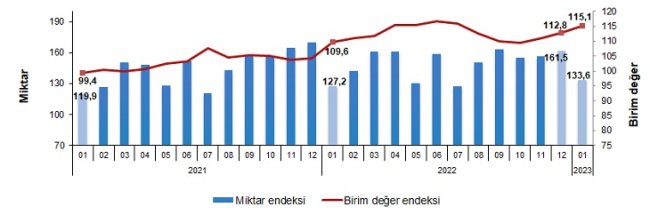 Ocak 2023 İhracat birim ve miktar değer endeksi her biri %5,0 arttı