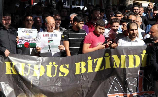Alanda bulunan yüzlerce kişi Filistin lehine, İsrail aleyhine sloganlar attı.