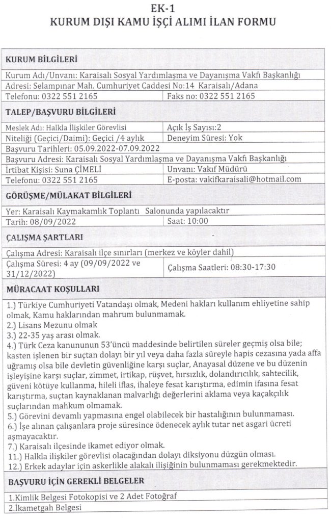 Karaisalı Sosyal Yardımlaşma ve Dayanışma Vakfı Geçici İşçi Alım İlanı Karaisalı Sosyal Yardımlaşma ve Dayanışma Vakfı Geçici İşçi Alım İlanı yayınladı 06 Eylül 2022 - 05:18 Paylaş Tweetle WhatsApp YORUMLAR 0 Yorum adlı kullanıcıya cevap YUNUS POLİSLERİ İLE EYLEMCİLER ARASINDA ARBEDE: ASİM BAŞKANI COŞKUN'DAN SAĞDUYU ÇAĞRISI ADANA’DAN GAZZE’YE MEŞALELİ DAYANIŞMA: YÜZLERCE ARAÇLIK KONVOYLA SOYKIRIMA LANET VALİ MUSTAFA YAVUZ KOZAN'DA Adana, Kudüs ve Mescid-i Aksa İçin Tek Yürek Oluyor! 2022-2023 Eğitim Öğretim Yılında Alınacak Asayiş/Trafik Tedbirleri Başkan Kocaispir: "El Ele, Gönül Gönüleyiz