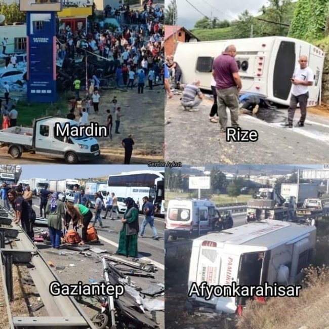 Mardin'in Derik ilçesinde freni boşalan gübre yüklü TIR'ın 2 araca çarparak devrildiği kazanın ardından, yaralılara müdahale eden kalabalığın arasına bir süre sonra gübre yüklü başka bir TIR daldı. 1 polisin şehit olduğu iki kazada toplam 20 kişi yaşamını yitirdi, 26 kişi de yaralandı. Gaziantep’te dün sabah meydana gelen trafik kazasında 15 kişi yaşamını yitirirken, yurt genelinde iki günde toplam 39 kişi trafik terörüne can verdi.