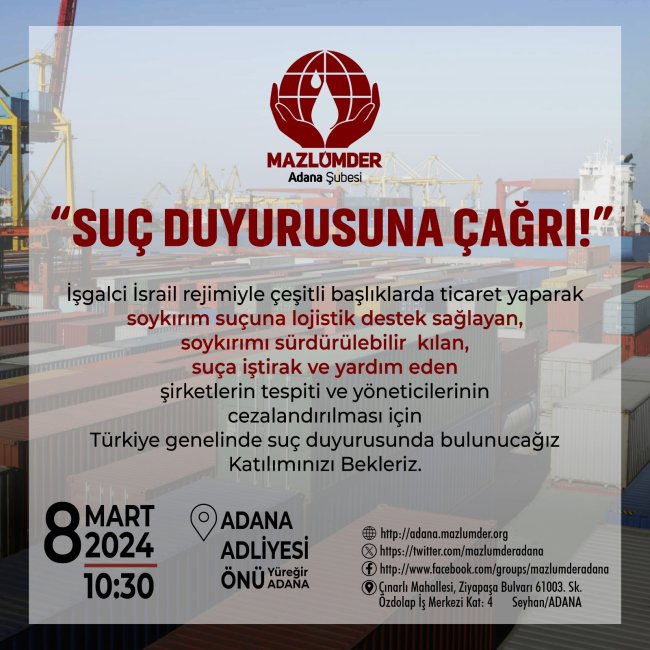 İşgalci İsrail rejimiyle ticaret yapan, soykırıma destek sağlayan, soykırımı sürdürülebilir kılan, suça yardım eden şirketlerin tespiti ve yöneticilerinin cezalandırılması için Adana Mazlumder olarak suç duyurusunda bulunuyoruz.