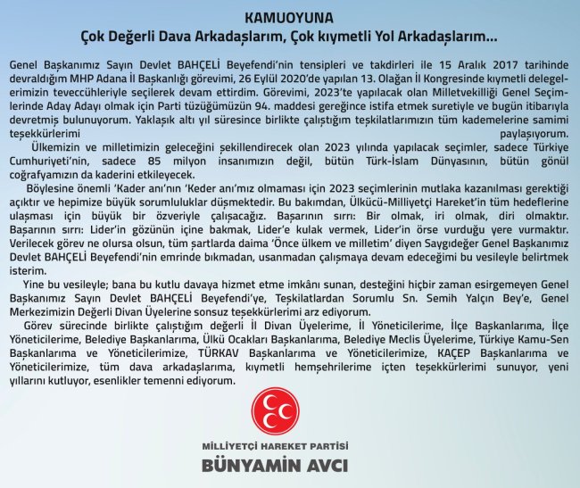 Bünyamin AVCI: "Milletvekilliği aday adaylığı için an itibarıyla il başkanlığı görevimden ayrılmış bulunmaktayım. Genel başkanımızın sonuna kadar emrinde tüm teşkilatlarımızın yanında hizmet etmeye devam edeceğim"