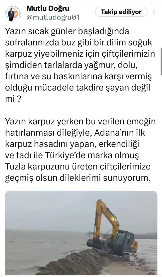 Yazın karpuz yerken bu verilen emeğin hatırlanması dileğiyle, Adana’nın ilk karpuz hasadını yapan, erkenciliği ve tadı ile Türkiye’de marka olmuş Tuzla karpuzunu üreten çiftçilerimize geçmiş olsun dileklerimi sunuyorum.