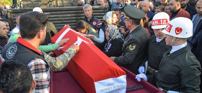 Baba ocağında evinin önünde helallik alınan Piyade Komando Binbaşı Mehmet Duman’ın eşi Beyhan Duman, eşinin naaşına son kez sarılarak güçlükle ayakta durdu.