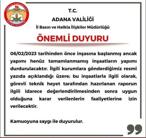 Adana Valiliği’nden yapılan açıklama şöyle: “06.02.2023 tarihinden önce inşasına başlanmış ancak yapımı henüz tamamlanmamış inşaatların yapımı durdurulacaktır. İlgili kurumlara gönderdiğimiz resmi yazıda açıklandığı üzere; bu inşaatlarla ilgili olarak, görevli teknik heyet tarafından hazırlanan raporun ilgili idarece değerlendirilmesinden sonra uygun olduğuna karar verilenlerin faaliyetlerine izin verilecektir.”