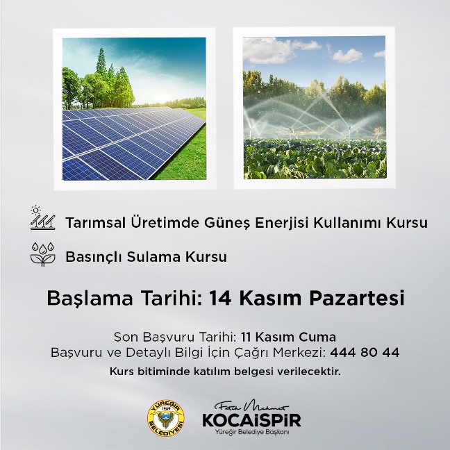 Yüreğir Belediyesi’nin ‘Tarımsal Üretimde Güneş Enerjisi Kullanımı Kursu’ ile ‘Basınçlı Sulama Kursu’ 14 Kasım Pazartesi günü başlıyor.