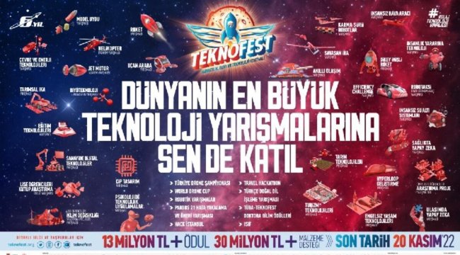 TEKNOFEST Havacılık, Uzay ve Teknoloji Festivali kapsamında düzenlenen dünyanın en büyük teknoloji yarışmaları için başvurular başladı. 13 milyon TL’nin üzerinde ödül, 30 milyon TL’nin üzerinde malzeme desteğinin verileceği TEKNOFEST 2023 teknoloji yarışmaları için son başvuru tarihi 20 Kasım 2022. Her yıl bir önceki yıla göre daha fazla yarışma kategorisinin açıldığı ve Türkiye tarihinin en büyük ödüllü teknoloji yarışmaları olan TEKNOFEST teknoloji yarışmaları bu yıl 41 ana yarışma 102 alt kategoride düzenleniyor.