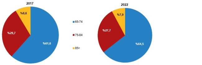 Yaşlı nüfusun yaş grubuna göre incelendiğinde, 2017 yılında yaşlı nüfusun %61,6'sının 65-74 yaş grubunda, %29,7'sinin 75-84 yaş grubunda ve %8,6'sının 85 ve daha yukarı yaş grubunda yer aldığı görülürken, 2022 yılında %64,5'inin 65-74 yaş grubunda, %27,7'sinin 75-84 yaş grubunda ve %7,9'unun 85 ve daha yukarı yaş grubunda yer aldığnını görüldüğü belirtildi.