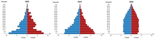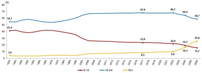 Yaş grubuna göre nüfus oranı, 1935-2080