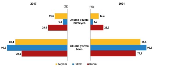 Yaşlı nüfusun cinsiyete göre okuma yazma oranı, 2017, 2021