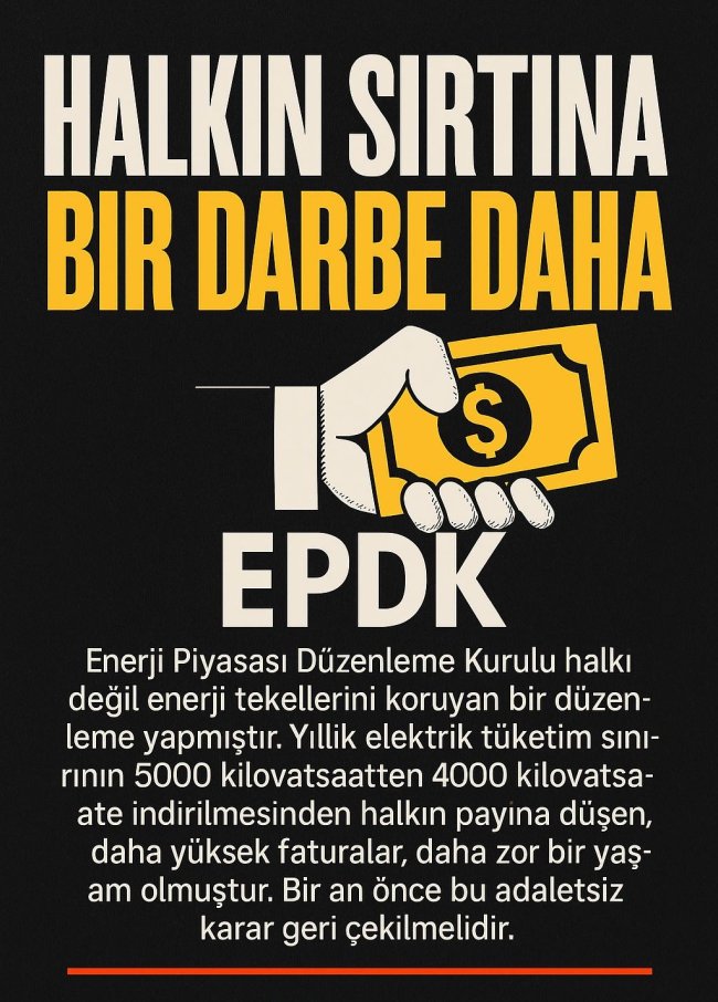 Enerji piyasasında yapılan bu tür düzenlemeler, dolaylı zamlarla halkın cebini yakmakta, hayatı daha da pahalı hale getirmektedir. Orta direk nefes almakta zorlanıyor. Ve bu karar, o nefesi daha da daraltıyor.