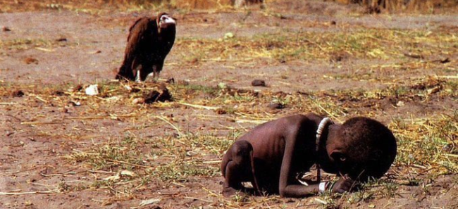 Kevin Carter çektiği fotoğraf ile fotoğraf dalında 1994’te Pulitzer ödülü kazanmıştı. Fotoğrafta, açlıktan dizi üstünde yüzü yere kadar düşmüş bir çocuk ve 3-4 metre uzağında bekleyen bir akbaba gözüküyordu. Bu fotoğrafın çekildiği yerden 2 km uzakta Birleşmiş Milletlerin Gıda destek ofisi varmış. Fotoğrafçı çocuğa yardım etmedi diye eleştirilmişti.